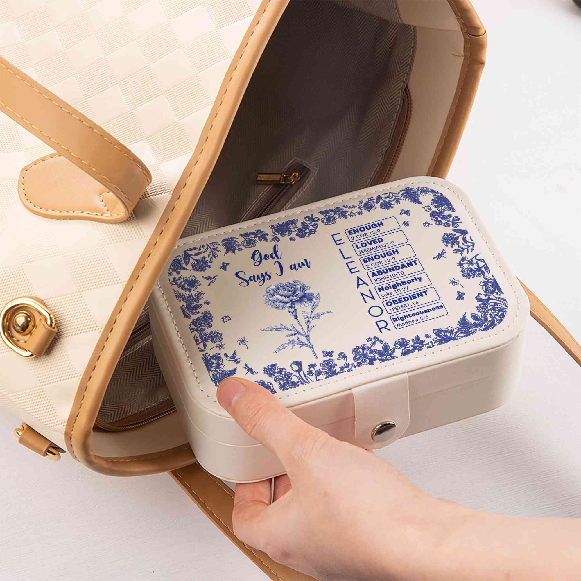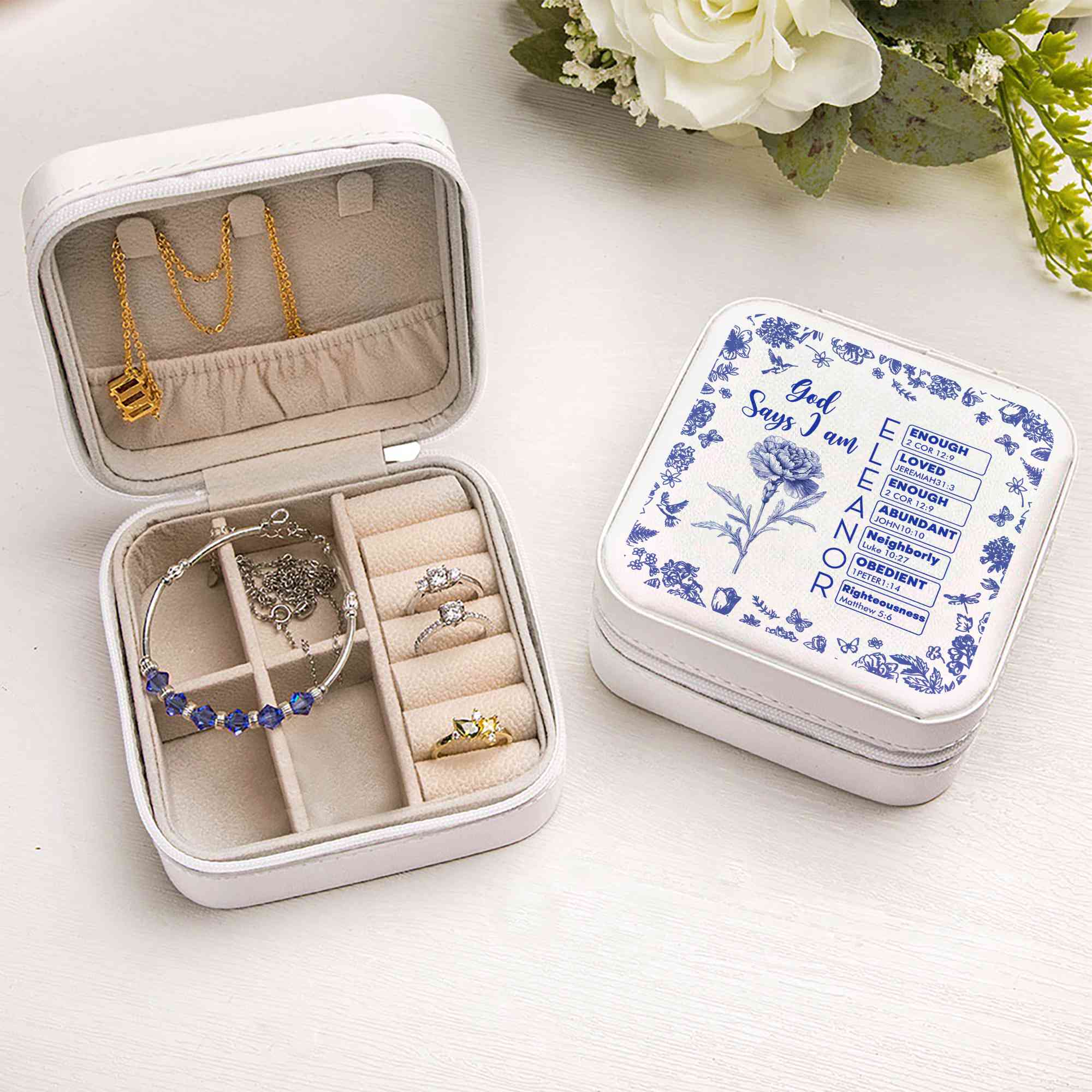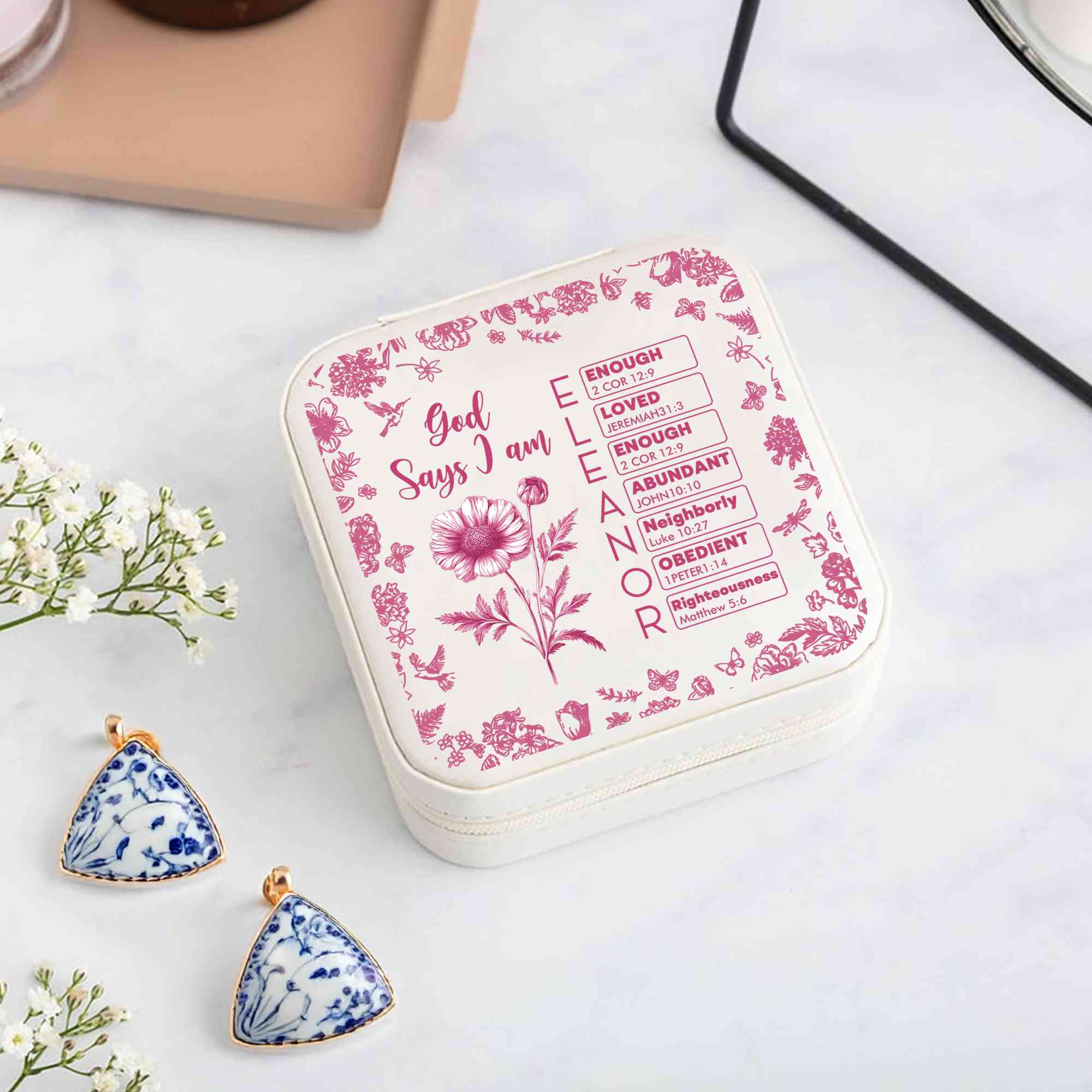 Elegant Toile De Jouy Design - This jewelry box features a timeless Toile De Jouy pattern paired with a delicate birth flower and “God Says I Am” Bible verses beginning with each letter of your entered name. Its compact structure with square/rectangular shape fits easily into a suitcase or bag, perfect for beauty lovers on the go.