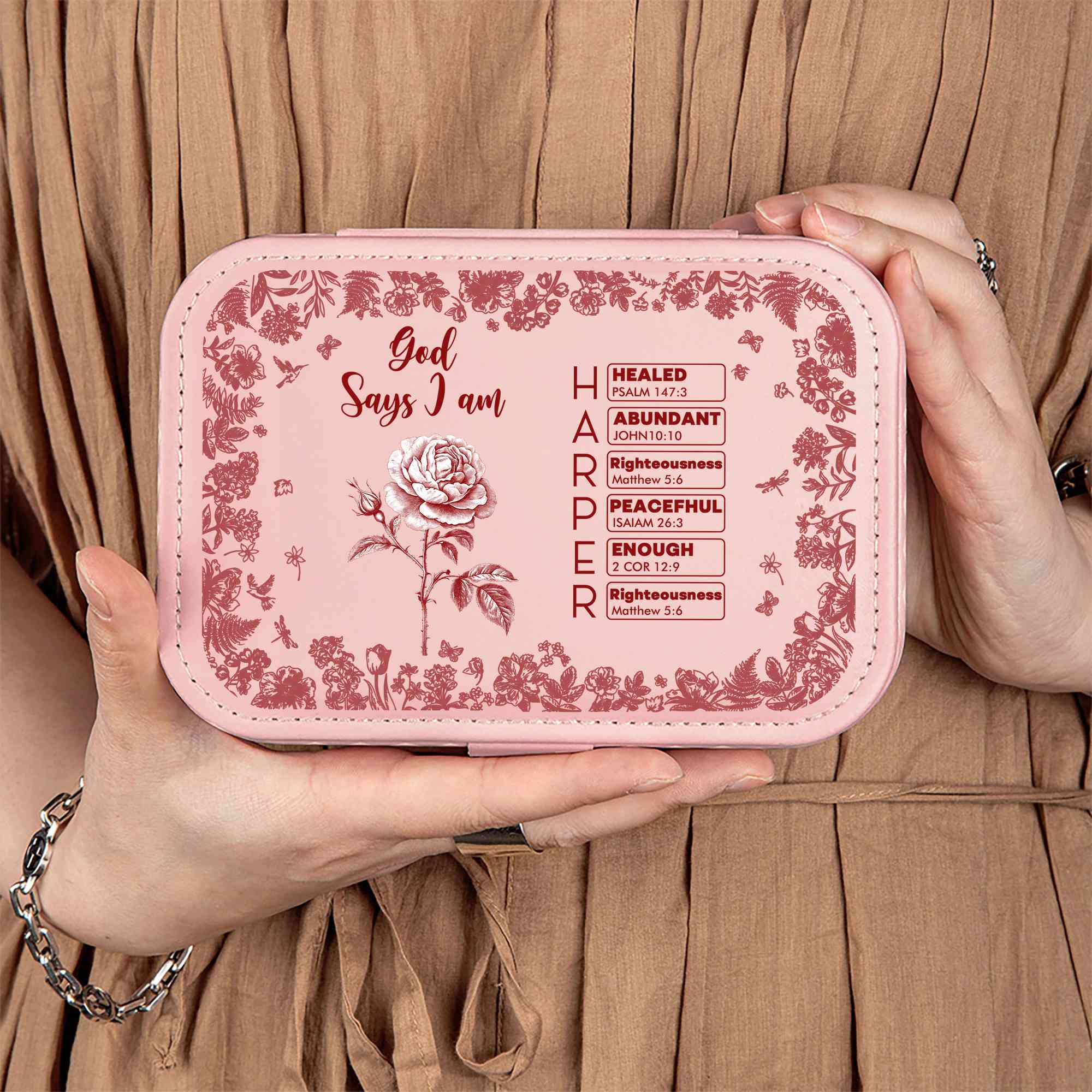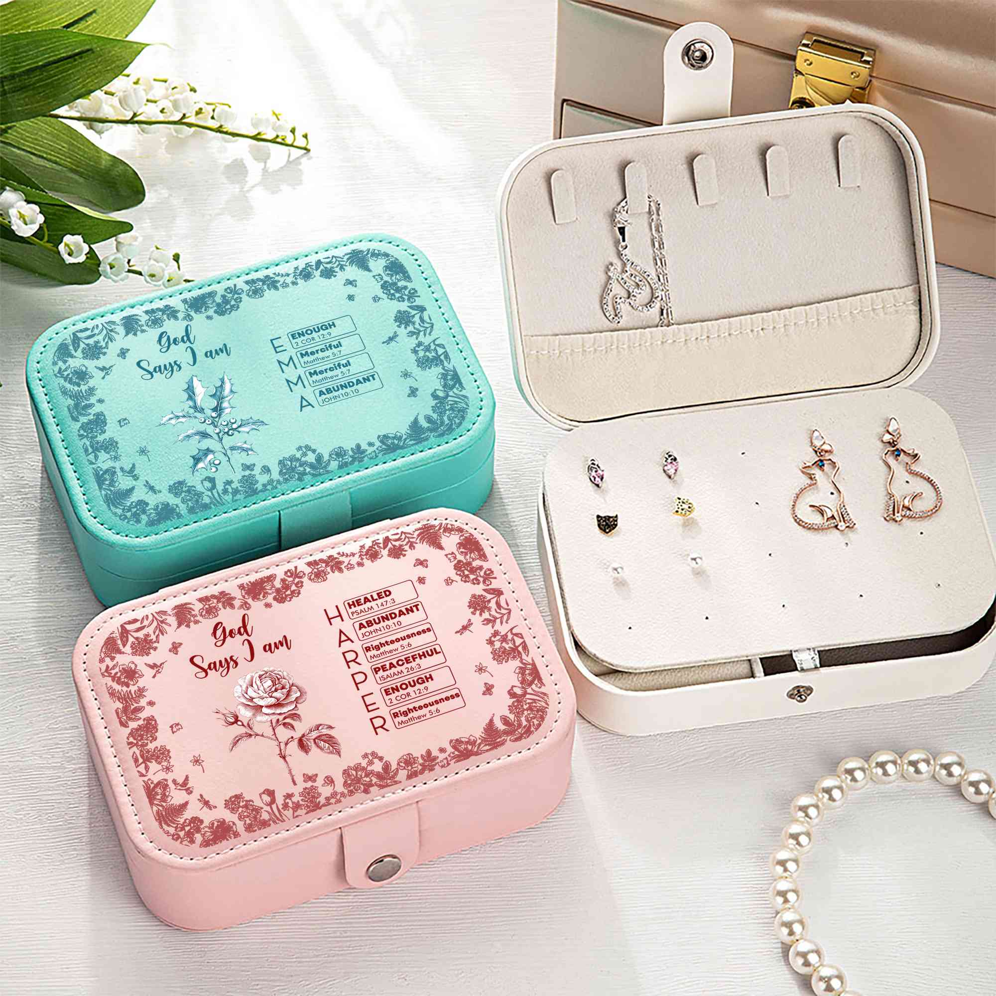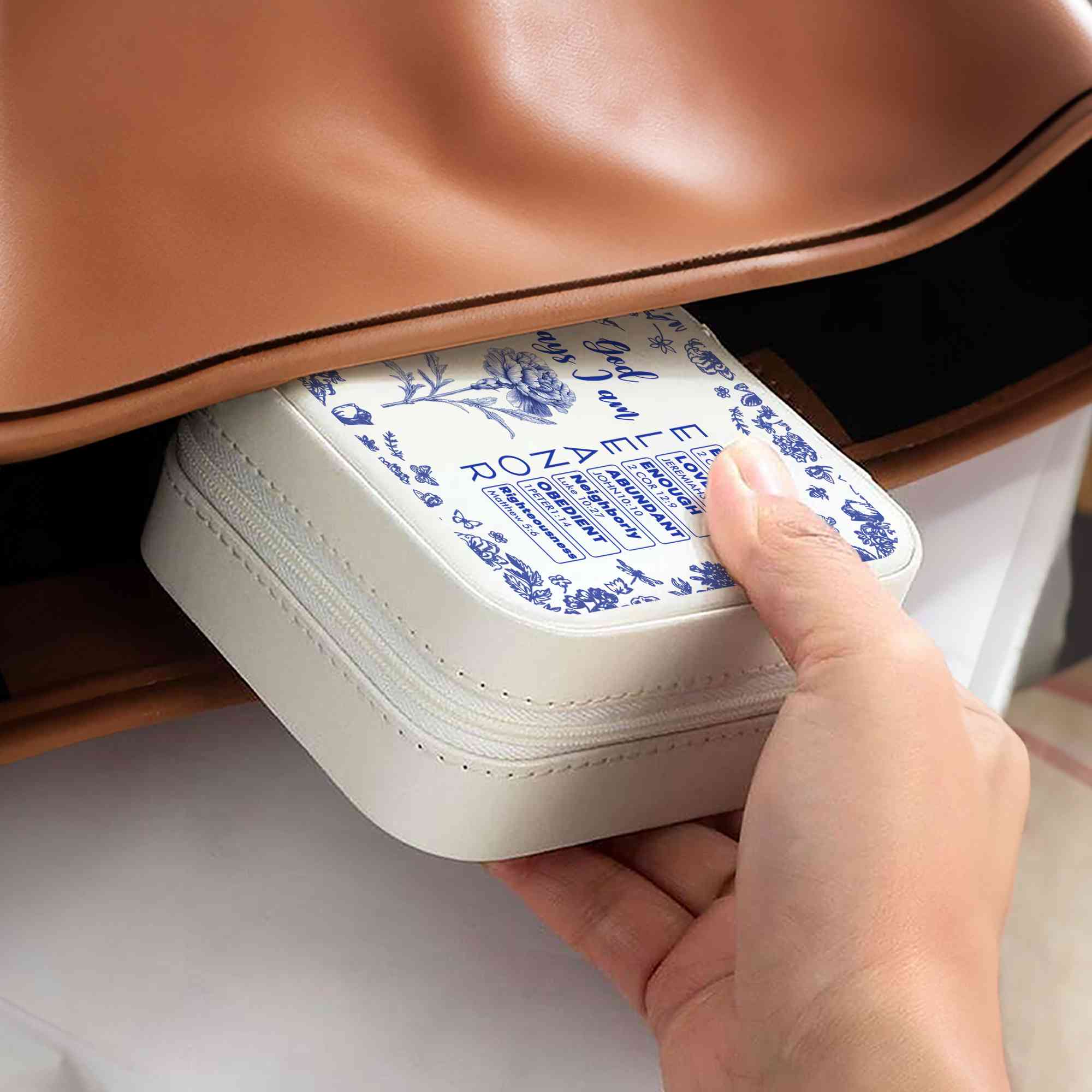 Elegant Toile De Jouy Design - This jewelry box features a timeless Toile De Jouy pattern paired with a delicate birth flower and “God Says I Am” Bible verses beginning with each letter of your entered name. Its compact structure with square/rectangular shape fits easily into a suitcase or bag, perfect for beauty lovers on the go.